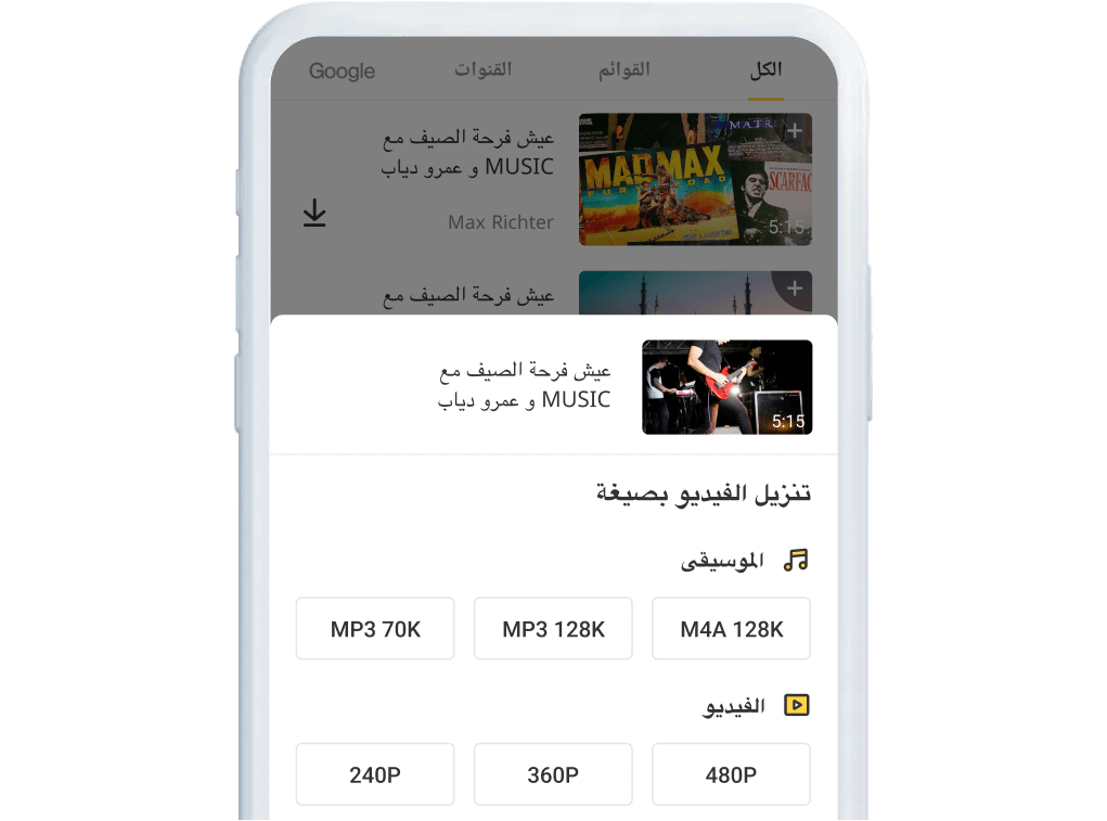- من خلال “تحميل كـ” “موسيقى” يمكنك اختيار الجودة المناسبة لك ثم الضغط على “تحميل” الموجودة بجانبها ليتم حفظه الفيديو بها على جهازك.